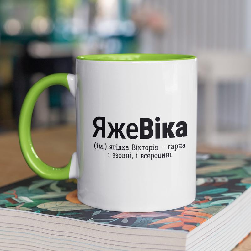 Чашка керамічна з принтом "яжевіка" 330 мл, біла з зеленою ручкою