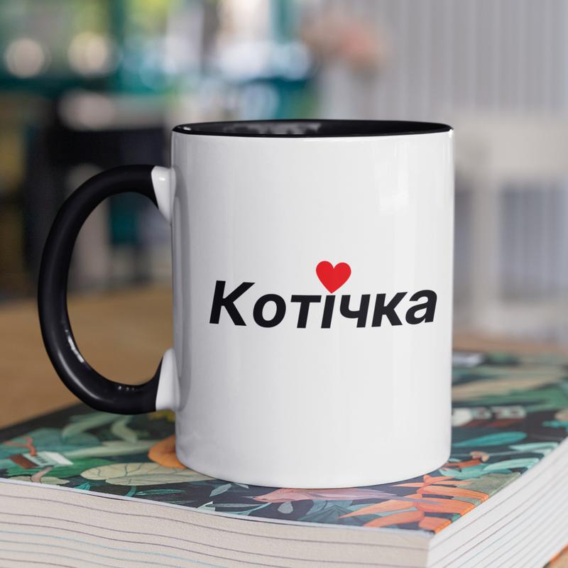 Чашка керамічна з принтом "котічка" 330 мл, біла з чорною ручкою