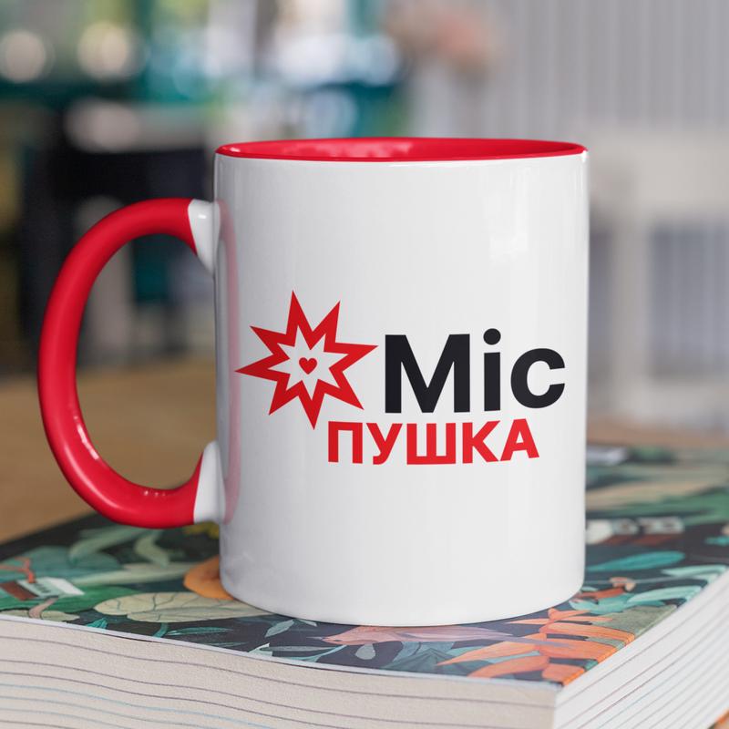 Чашка керамічна з принтом "міс пушка" 330 мл, біла з червоною ручкою