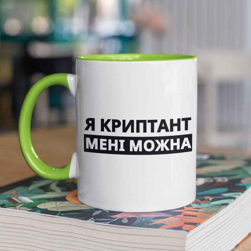 Чашка керамічна з принтом "я криптант мені можна" 330 мл, біла з зеленою ручкою |easypick|