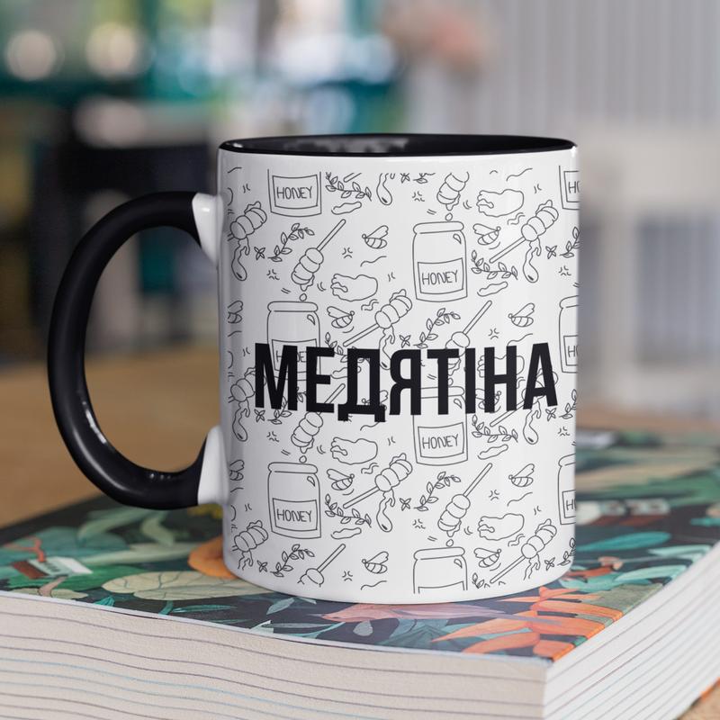 Чашка керамічна з принтом "медятіна" 330 мл, біла з чорною ручкою |easypick|