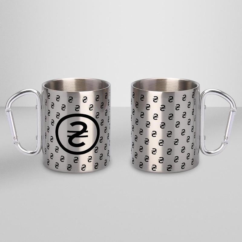 Чашка металева з принтом "гривня" 300 мл з карабіном, срібляста |easypick|