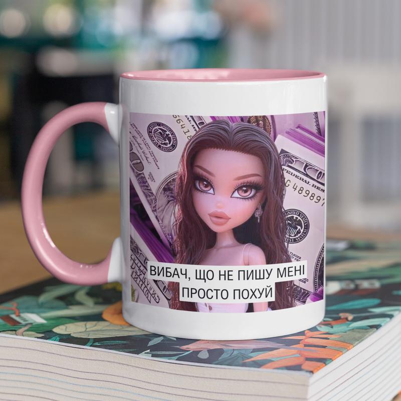 Чашка керамічна з принтом "вибач що не пишу" 330 мл, біла з рожевою ручкою |easypick|