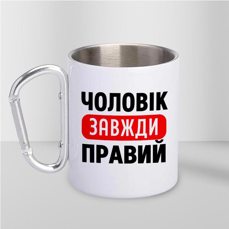 Чашка металева з принтом "чоловік завжди правий" 300 мл з карабіном, біла |easypick|