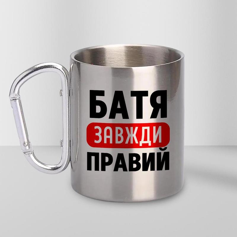 Чашка металева з принтом "батя завжди правий" 300 мл з карабіном, срібляста |easypick|