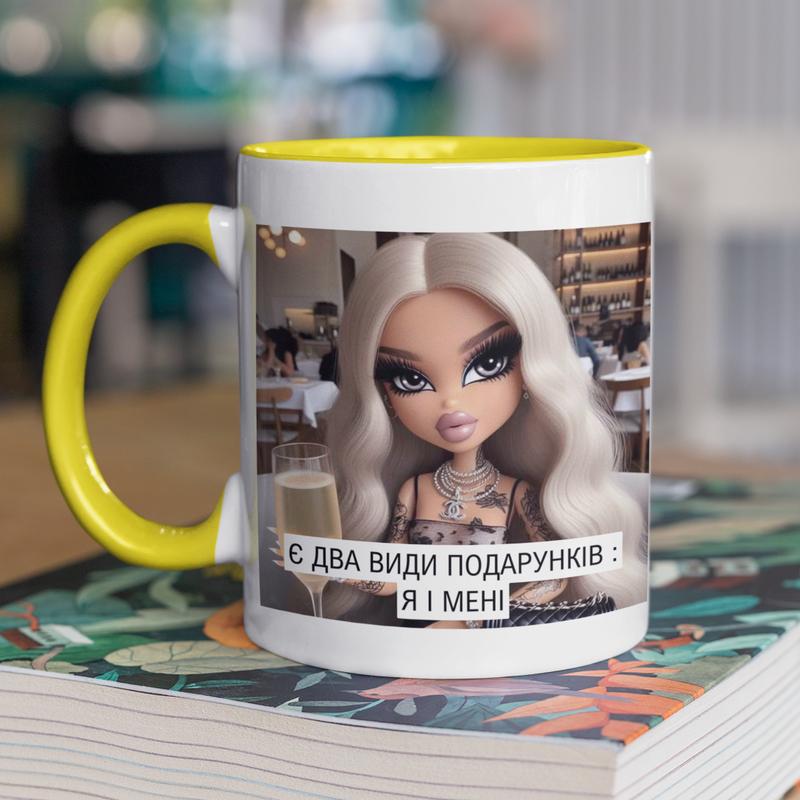 Чашка керамічна з принтом "є два види подарунків я і мені" 330 мл, біла з жовтою ручкою |e...