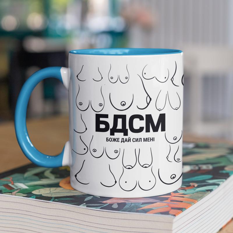 Чашка керамічна з принтом "бдсм боже дай сил мені" 330 мл, біла з блакитною ручкою |easyp...