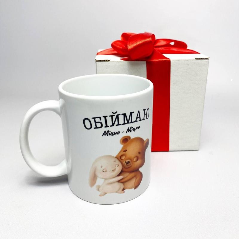 Кружка керамічна з принтом "обіймаю міцно" 330 мл у подарунковій коробці з бантом