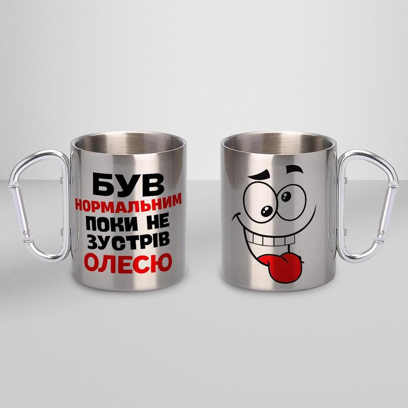 Кружка металева з карабіном "був нормальним поки не зустрів олесю" 300 мл срібляста