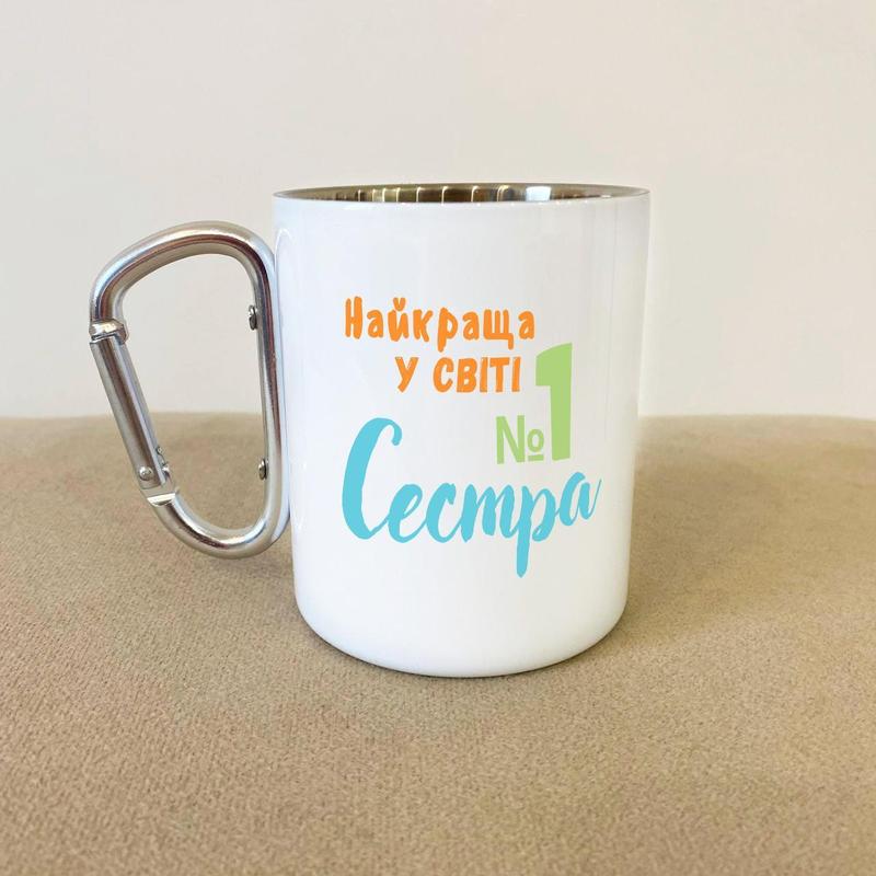 Кружка металева з карабіном "найкраща у світі сестра" 300 мл біла