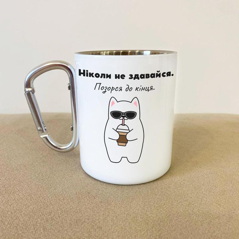 Кружка металева з карабіном "ніколи не здавайся" 300 мл біла