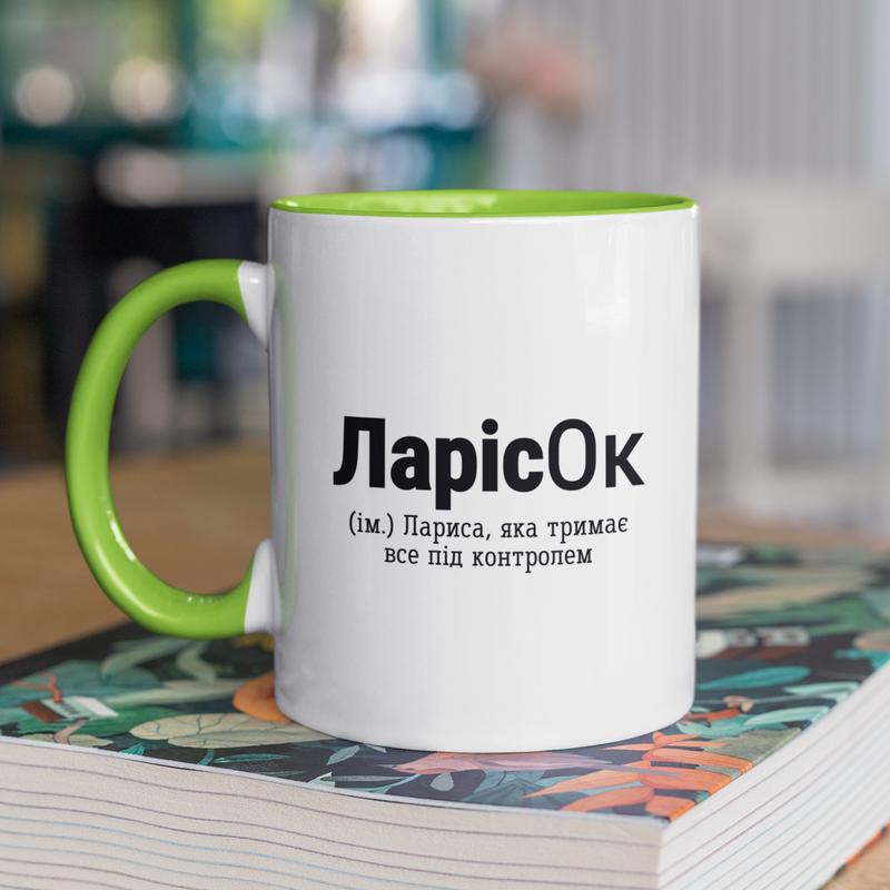 Чашка керамічна з принтом "ларисок" 330 мл, біла з зеленою ручкою