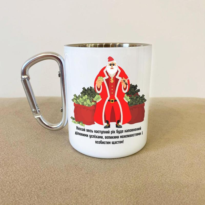 Кружка металева з карабіном "дід мороз з грошима" 300 мл біла