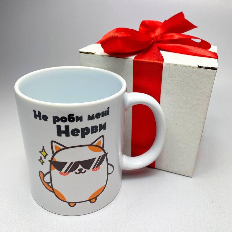 Кружка керамічна з принтом "не роби мені нерви" 330 мл у подарунковій коробці з бантом
