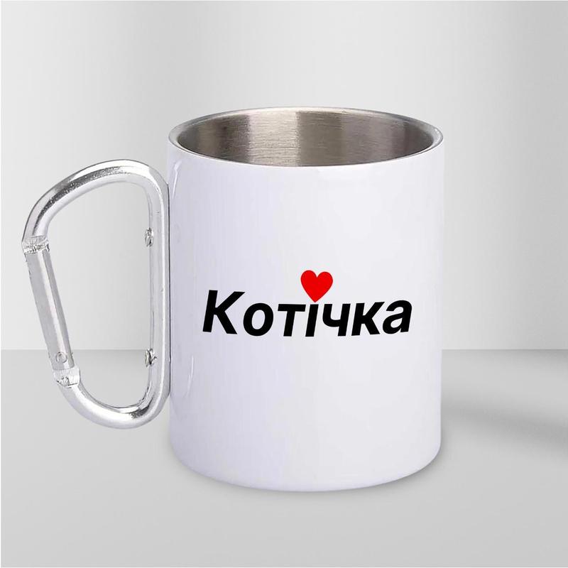 Чашка металева з принтом "котічка" 300 мл з карабіном, біла