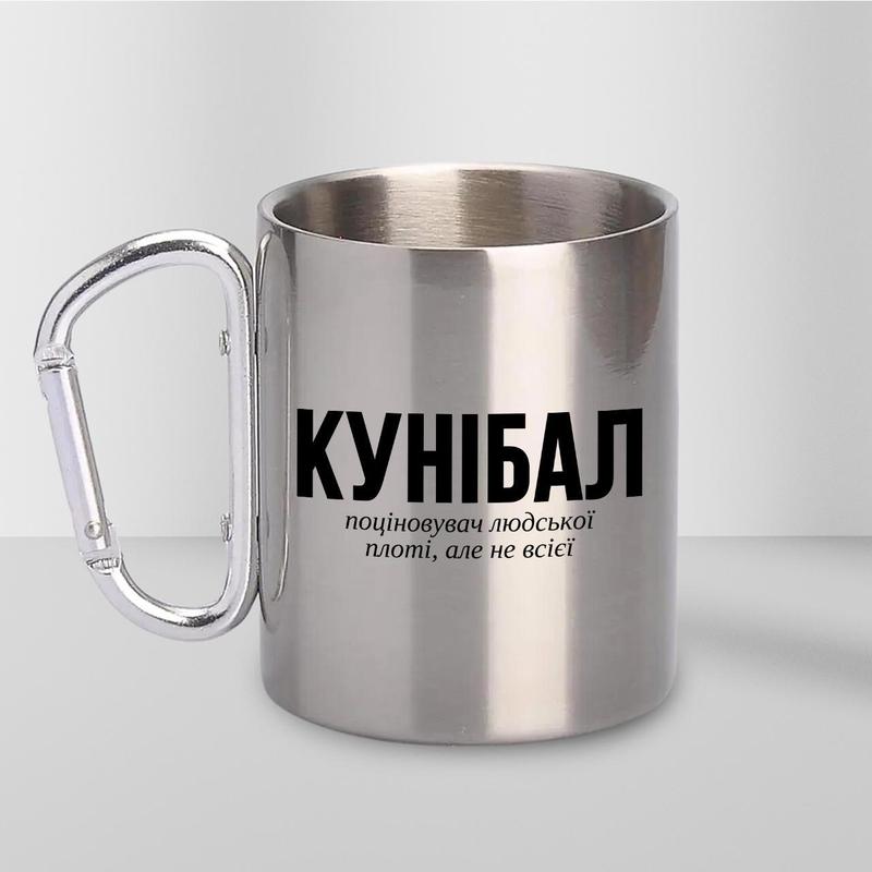 Чашка металева з принтом "кунібал" 300 мл з карабіном, срібляста