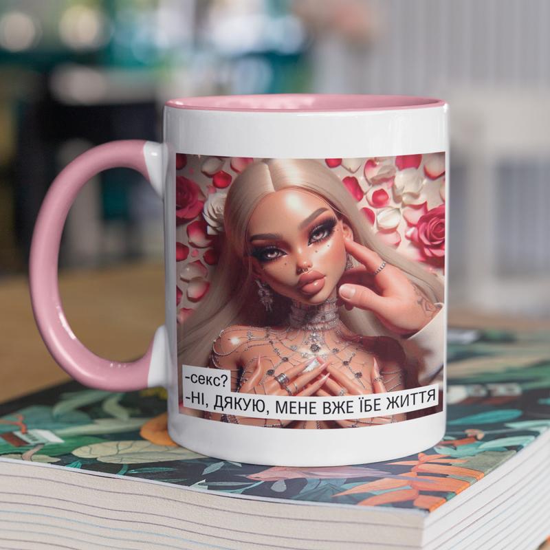 Чашка керамічна з принтом "мене ї*е життя" 330 мл, біла з рожевою ручкою