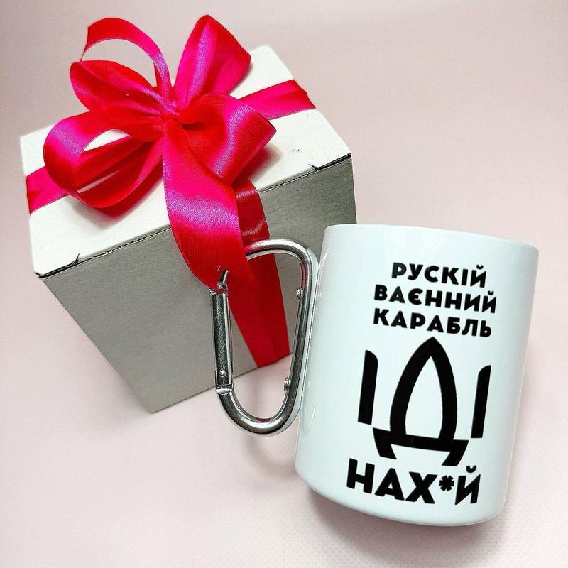 Кружка металева з карабіном "рускій карабль нах" 300 мл у подарунковій коробці з бантом