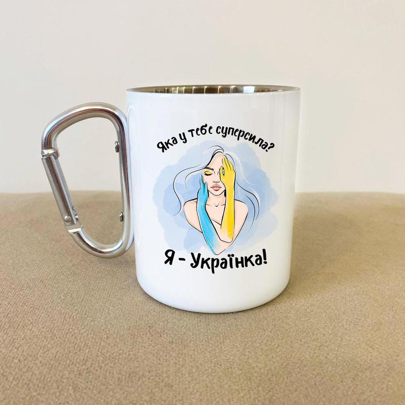Кружка металева з карабіном "супер сила українка" 300 мл біла