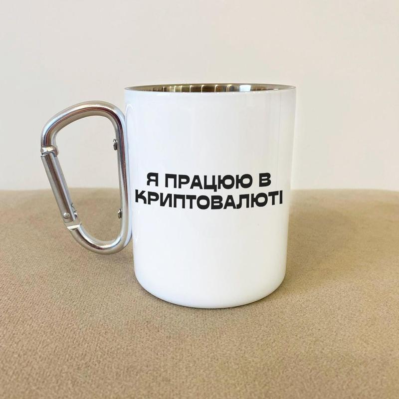Кружка металева з карабіном "я працюю в криптовалюті" 300 мл біла