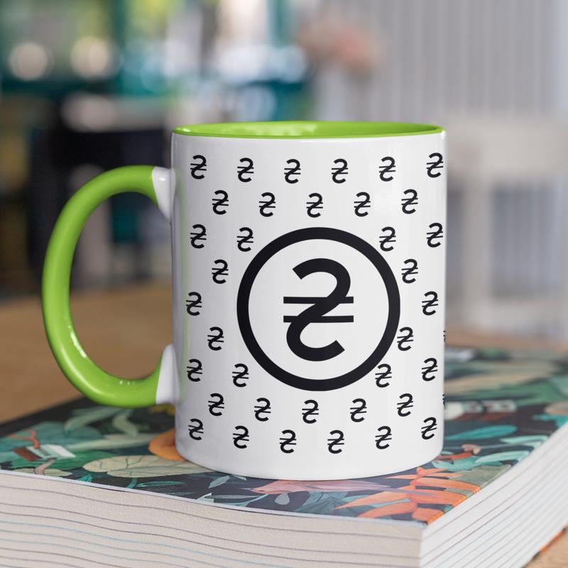 Чашка керамічна з принтом "гривня" 330 мл, біла з зеленою ручкою