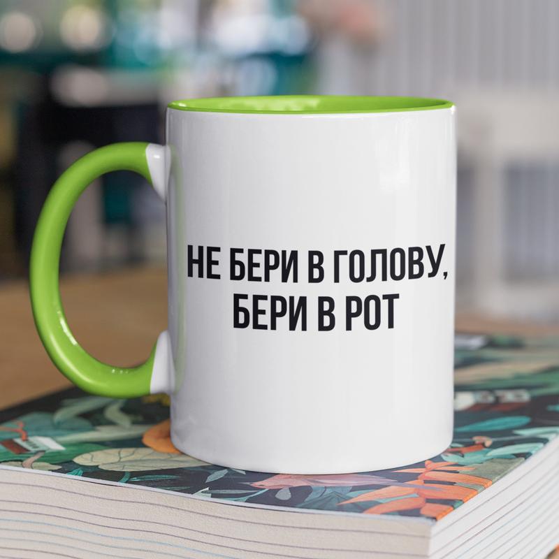 Чашка керамічна з принтом "не бери в голову" 330 мл, біла з зеленою ручкою