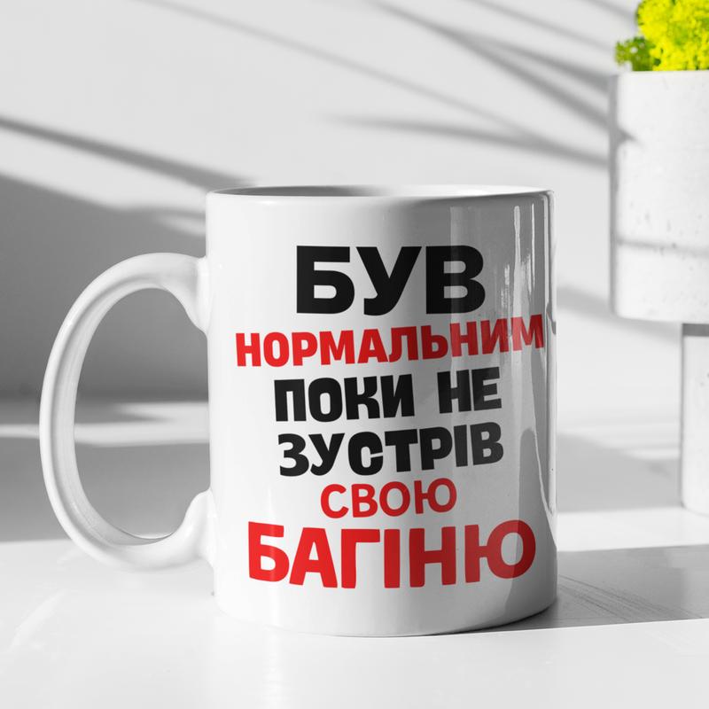 Чашка керамічна з принтом "був нормальним поки не зустрів багіню" 330 мл, біла
