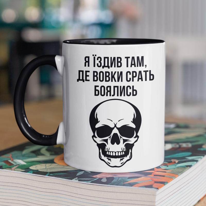 Чашка керамічна з принтом "я їздив там де вовки боялись" 330 мл, біла з чорною ручкою