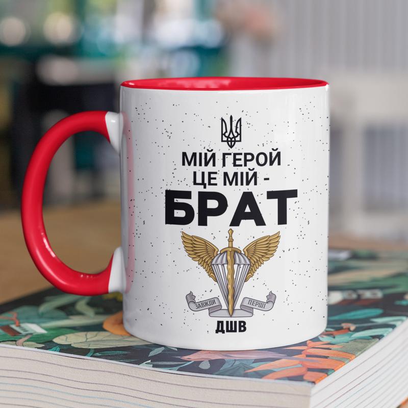 Чашка керамічна з принтом "мій герой це мій брат" 330 мл, біла з червоною ручкою