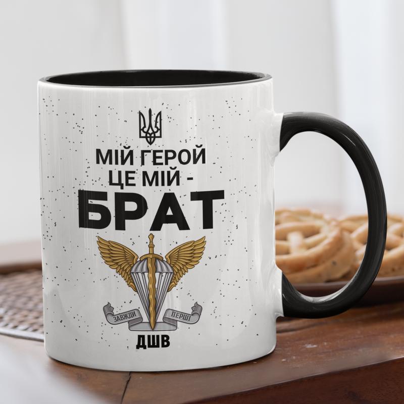 Чашка керамічна з принтом "мій герой це мій брат" 330 мл, біла з чорною ручкою