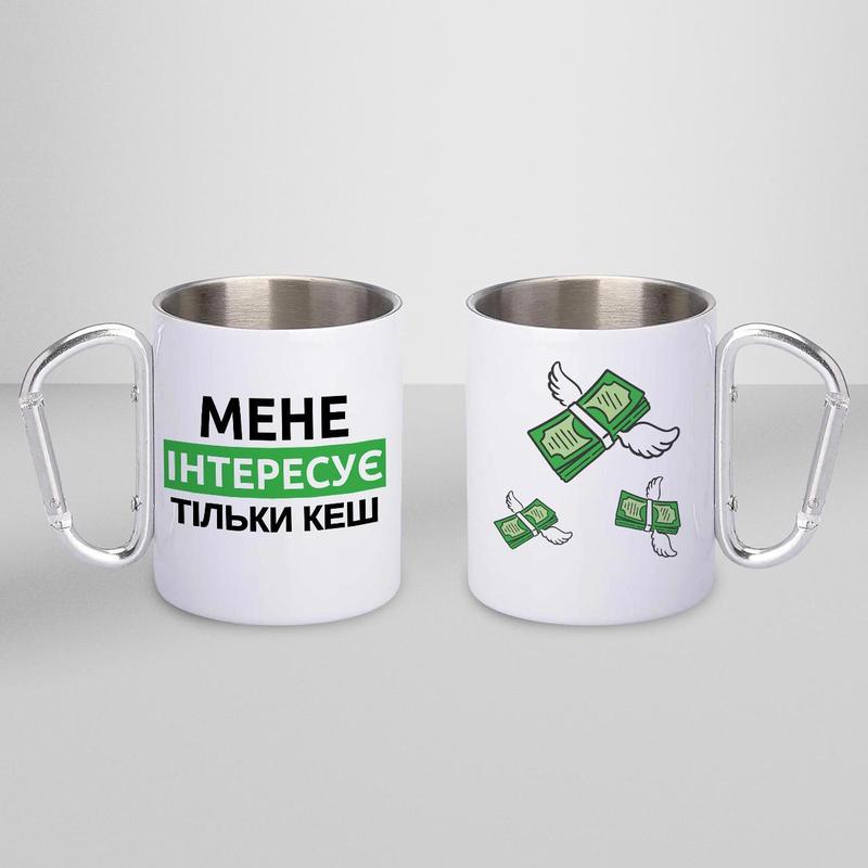 Чашка металева з принтом "мене інтересує тільки кеш" 300 мл з карабіном, біла