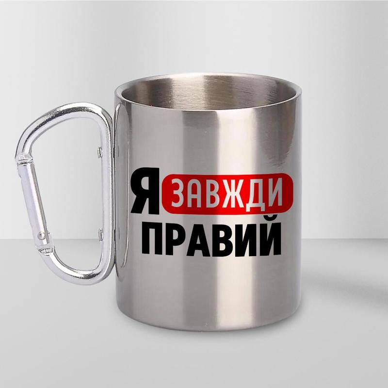 Чашка металева з принтом "я завжди правий" 300 мл з карабіном, срібляста