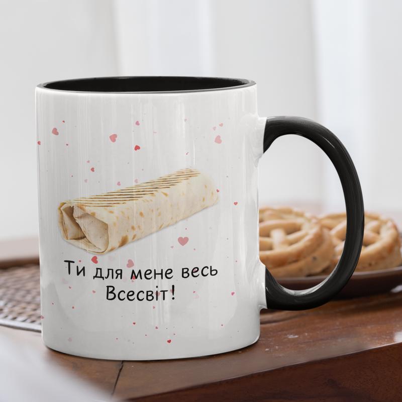 Чашка керамічна з принтом "шаурма" 330 мл, біла з чорною ручкою