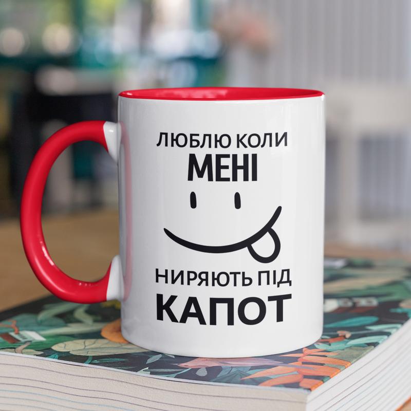 Чашка керамічна з принтом "люблю коли ниряють під капот" 330 мл, біла з червоною ручкою