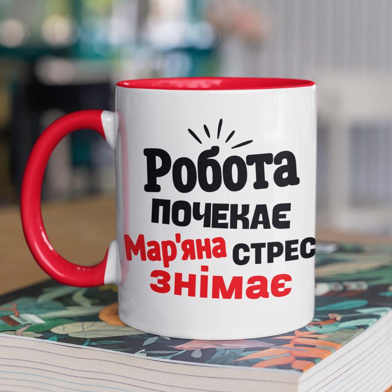 Чашка керамічна з принтом "марʼяна стрес знімає" 330 мл, біла з червоною ручкою