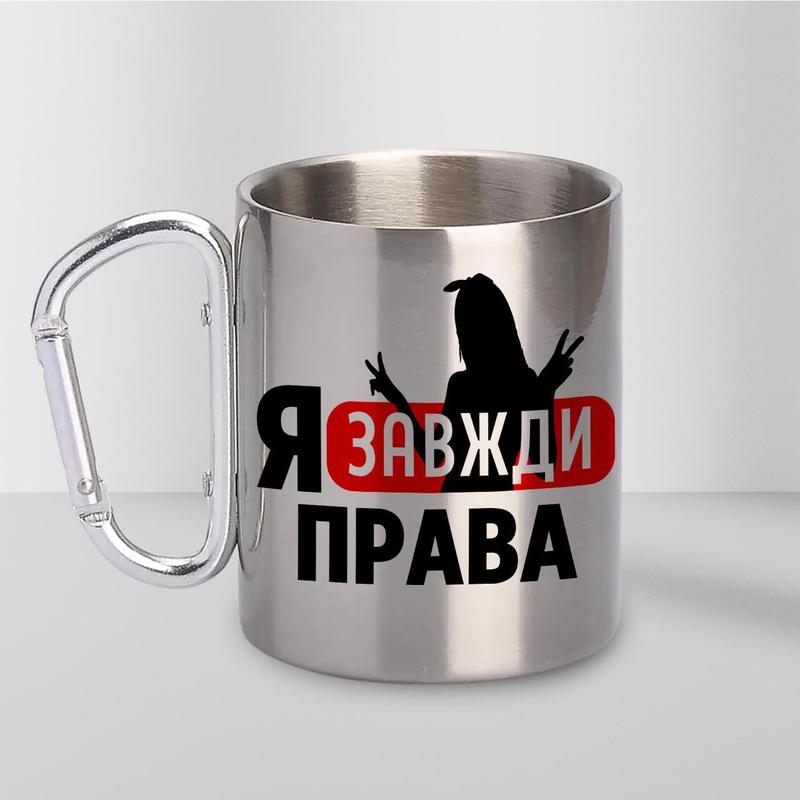 Чашка металева з принтом "я завжди права" 300 мл з карабіном, срібляста