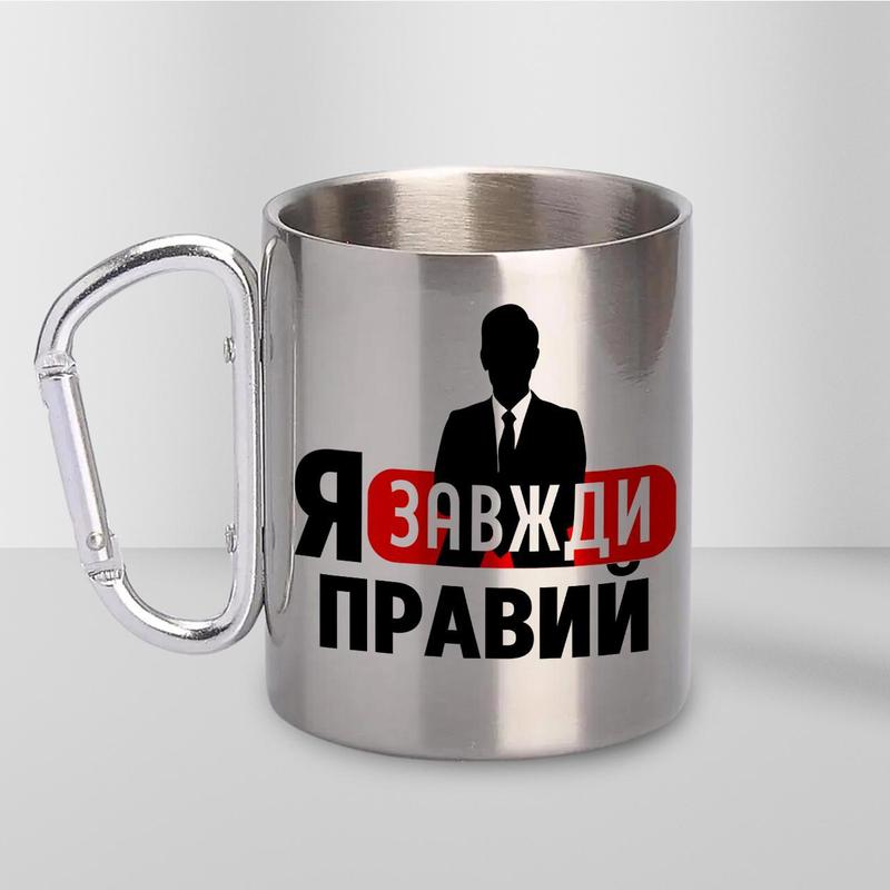 Чашка металева з принтом "я завжди правий" 300 мл з карабіном, срібляста