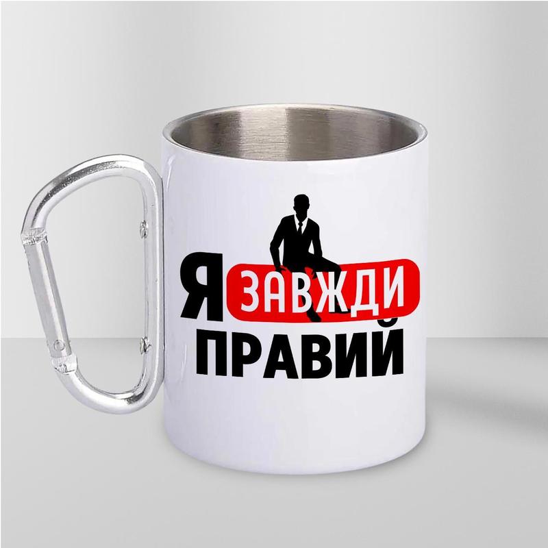 Чашка металева з принтом "я завжди правий" 300 мл з карабіном, біла