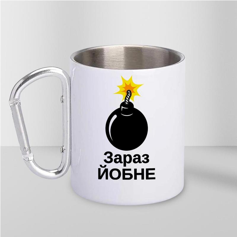 Чашка металева з принтом "зараз йо*не" 300 мл з карабіном, біла