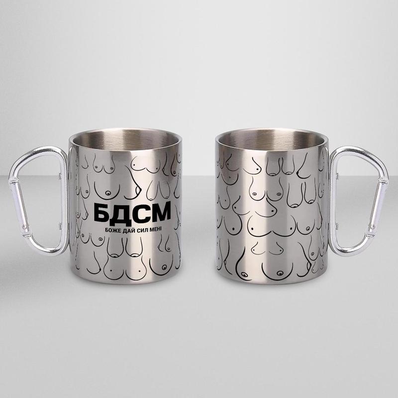 Чашка металева з принтом "бдсм боже дай сил мені" 300 мл з карабіном, срібляста