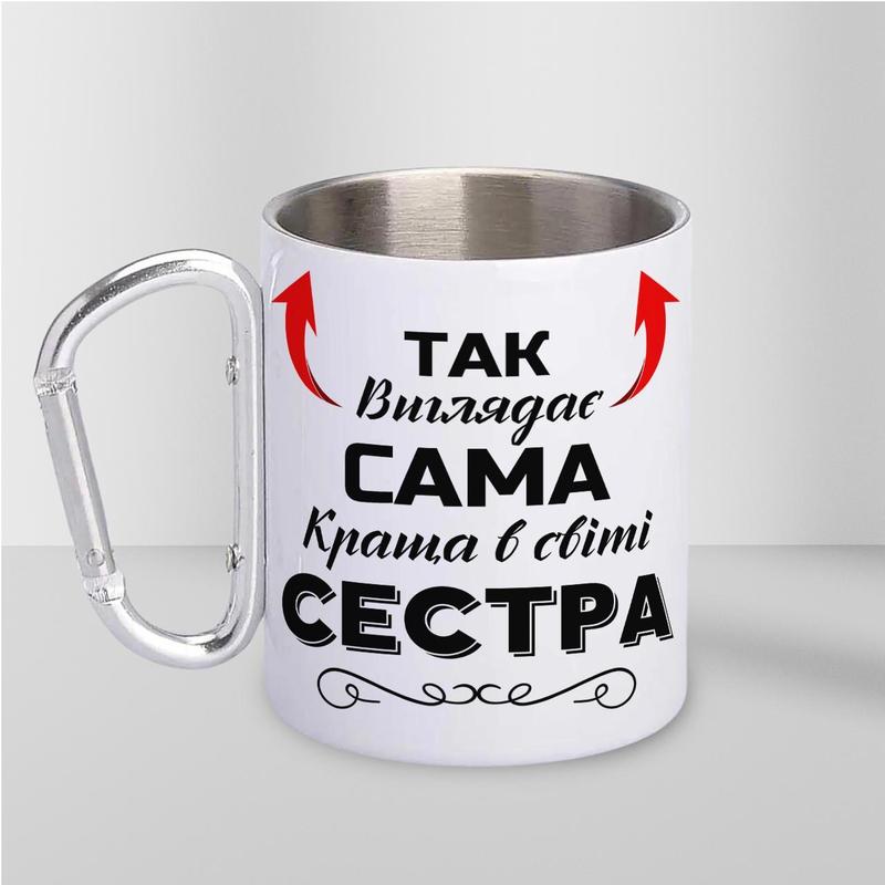 Кружка металева з карабіном "так виглядає сама краща сестра" 300 мл біла |краща ціна|