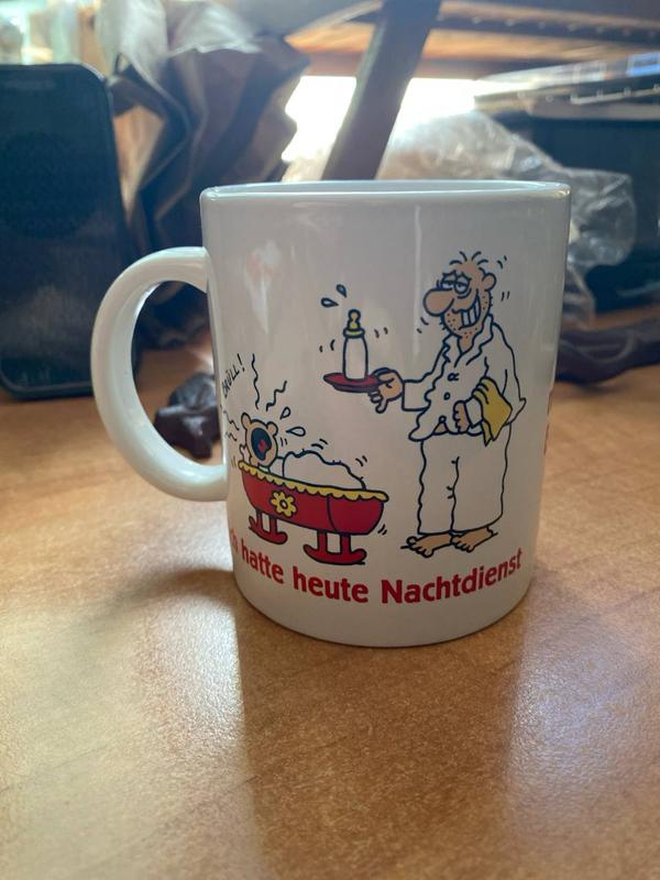 Чашка с надписью "я дежурил сегодня ночью" (перевод с немецкого)