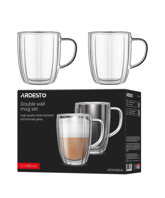 Набір чашок ardesto ar2645bhn 450 мл з подвійними стінками, боросилікатне скло, 2 шт
