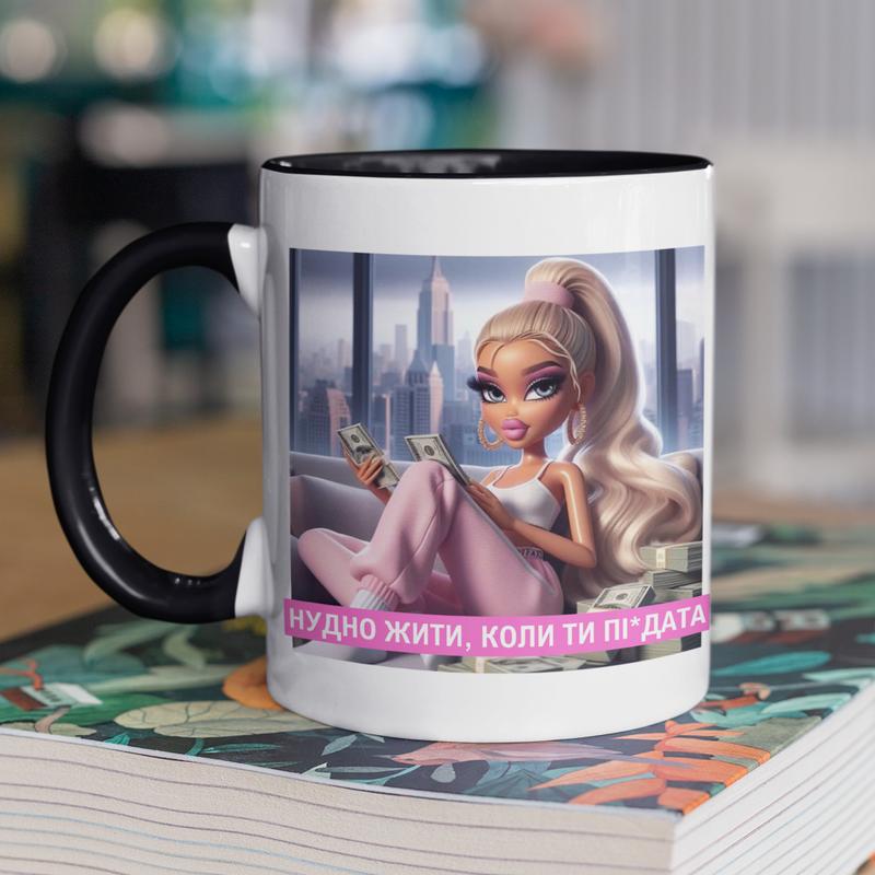 Чашка керамічна з принтом "нудно жити коли ти пі*дата" 330 мл, біла з чорною ручкою