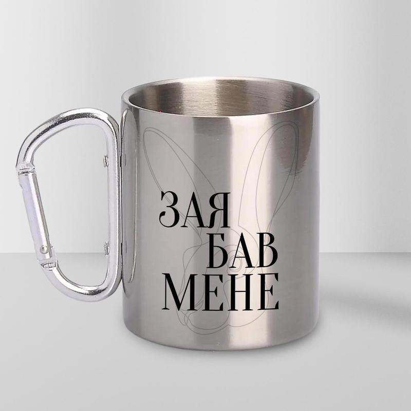 Чашка металева з принтом "зая бав мене" 300 мл з карабіном, срібляста