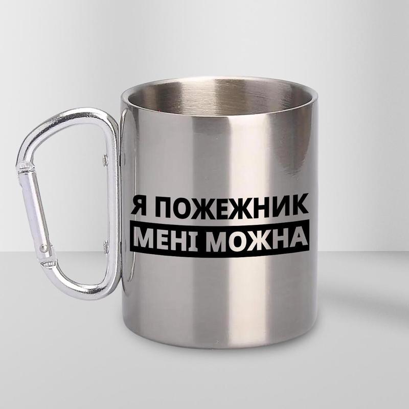 Чашка металева з принтом "я пожежник мені можна" 300 мл з карабіном, срібляста