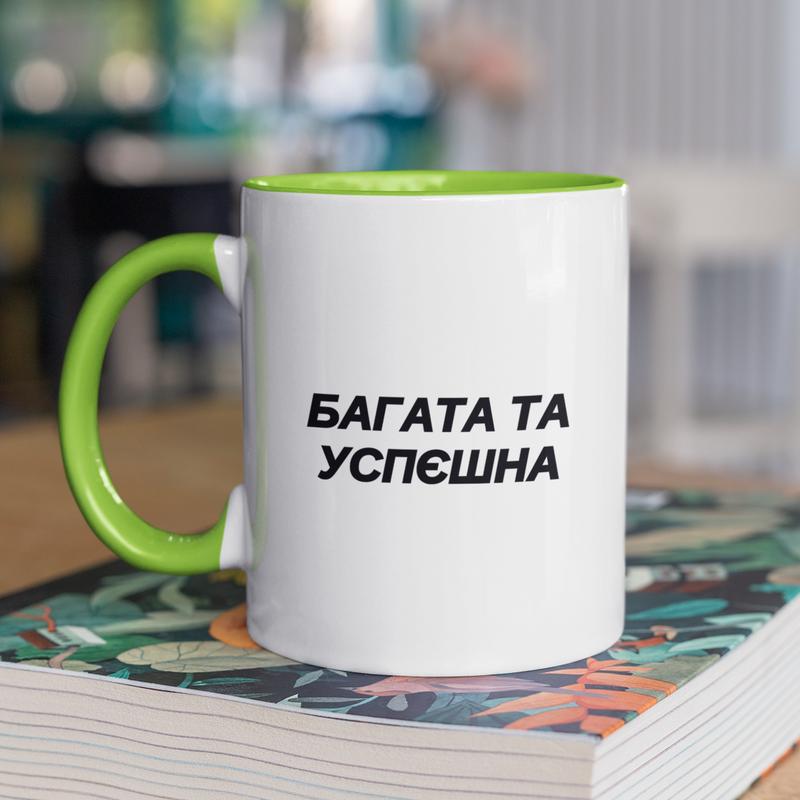 Чашка керамічна з принтом "багата та успєшна" 330 мл, біла з зеленою ручкою