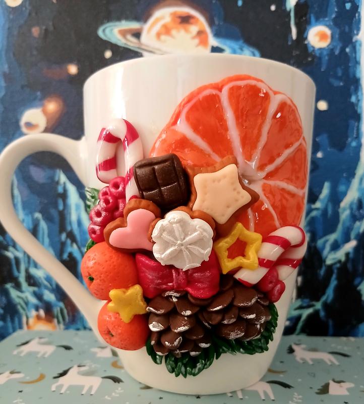 Декор ручной работы с полимерной глиной.Иссокращается как обычная чашка, не бояться высоких температур.Едине нельзя мыть в посудомоечной посуде.