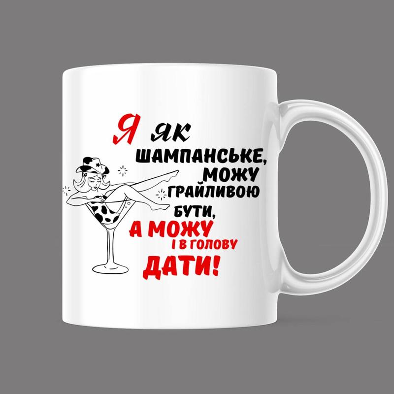 Прикольная чашка с принтом "я как шампанское, могу игривой быть, а могу и в голову дать",...