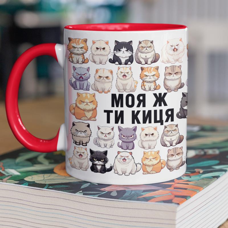 Чашка керамічна з принтом "моя ж ти киця" 330 мл, біла з червоною ручкою